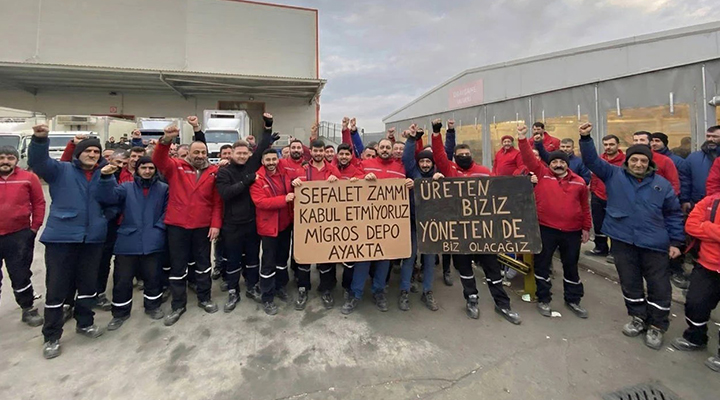 “Yaşayabilmek için emeklerini Migros işverenine satan kadınlar ve erkekler direnişteler. Migros reklamlarında dolu dolaplar, güzel sofralar, konforlu evlerde gülen insanlar görülüyor. Gerçekte ise sefalet ücretine mahkûm edilen emekçiler haklarını aradıklarında baskıyla karşılaşıyor.