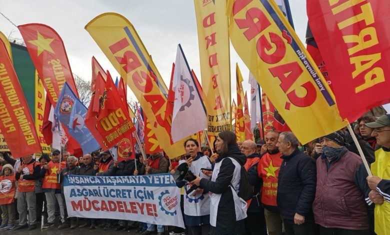 Açıklama boyunca “Asgari değil, insanca yaşam”, “İşçilerin birliği sermayeyi yenecek” ve “Kahrolsun ücretli kölelik düzeni” sloganları atıldı.