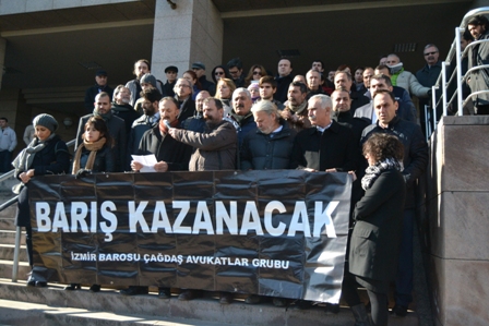 İzmir Adliyesi önünde yapılan eylemde “Barış kazanacak” yazılı pankart açıldı. Kitle adın abasın açıklamasını Avukat Yakup Gül okudu.