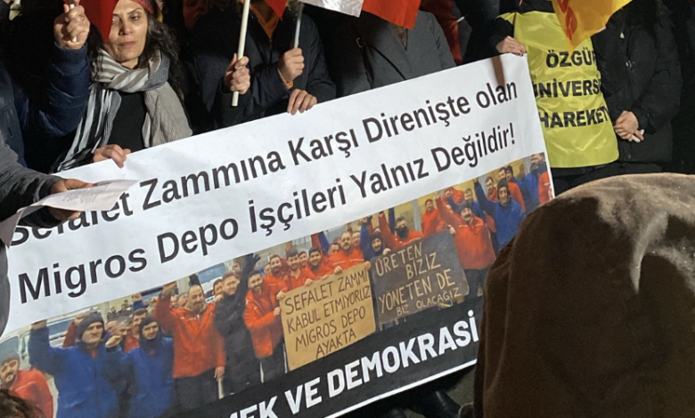 Emekçilerin ağır vergi yükü, yüksek enflasyon ve barınma kriziyle karşı karşıya olduğu bir dönemde, Migros depo işçileri yüzde 28’lik zam oranına karşı direnişlerini sürdürüyor. Ankara Emek ve Demokrasi Güçleri, Migros işçilerinin taleplerine dikkat çekmek ve direnişi sahiplenmek amacıyla basın açıklaması gerçekleştirdi.