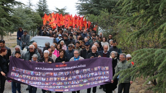 Saldırıda hayatını kaybedenlerin fotoğraflarının yer aldığı “10 Ekim Katliamını Unutturmayacağız” pankartının taşındığı anmada, “10 Ekim’i unutma, unutturma”, “Savaşa hayır, barış hemen şimdi” ve “Katil devlet hesap verecek” sloganları atıldı.