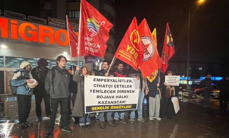 Ankara’nın 100. Yıl Mahallesi’nde bulunan MM Migros önünde bir araya gelen gençlik örgütleri, Türkiye’nin desteklediği HTŞ ve DAİŞ’e bağlı grupların Rojava’ya dönük saldırılarına karşı basın açıklaması yaptı. Eylemde “Emperyalistler, cihatçı çeteler kaybedecek; direnen Rojava halkı kazanacak” pankartı açılırken, “Bijî berxwedana Rojava” ve “Kobanê ruhuyla gençlik ayakta” yazılı dövizler taşındı.