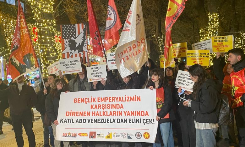 Ankara’da aralarında Yeni Demokrat Gençlik’in (YDG) de bulunduğu gençlik örgütleri, ABD’nin Venezuela’ya yönelik emperyalist saldırısını Yüksel Caddesi’nde düzenledikleri eylemle protesto etti. “Gençlik emperyalizmin karşısında, direnen halkların yanında” pankartının açıldığı eylemde, “Emperyalizme karşı omuz omuza” ve “Emperyalizm yenilecek, direnen halklar kazanacak” sloganları atıldı.