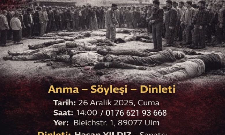 19–28 Aralık tarihleri arasında, geçmişten bugüne uzanan insanlığa karşı suçları unutmamak ve unutturmamak için bir araya geliyoruz.Maraş, Hapishaneler ve Roboski Katliamları; Yalnızca yaşanmış acılar değil, aynı zamanda hesabı sorulmamış birer hâkikattir.26 Aralık 2025 Cuma günü Ulm’de Tohum Kültür Merkezin’de gerçekleşecek anma, söyleşi ve dinleti etkinliğimizde; hafızayı diri tutmak, adalet talebini büyütmek ve ortak mücadele zeminini güçlendirmek için buluşuyoruz.