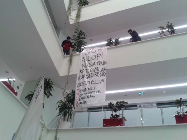 Bugün saat 11.30 sıralarında Kartal Belediyesi’ni işgal eden DDSB’liler, belediye binasının ara katından “Sur, Silopi, Nusaybin, katliamlara karşı direnişi büyütelim” yazılı pankartı astılar. “Kürdistan faşizme mezar olacak”, “Kürdistan’da düşene dövüşene bin selam”, “Katil devlet hesap verecek” gibi sloganlar atan DDSB’liler, ajitasyonlarla işçi ve emekçilerin T. Kürdistanı’ndaki katliamlara karşı ayağa kalkması gerektiğini belirttiler. Kartal Belediyesi işçilerine yapılan çağrılarda, “Gün direnişi büyütme günüdür” denildi.