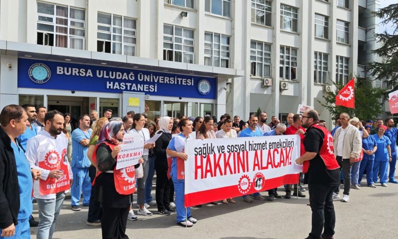 Dev Sağlık-İş, sağlık işçilerinin toplu sözleşmeden kaynaklanan geriye dönük alacaklarının işveren tarafından taksitlendirilmesine karşı Uludağ Üniversitesi Tıp Fakültesi önünde eylem yaptı. İşçiler, “Sağlık işçileri yine sefalete mahkum edilmiştir” diyerek karara tepki gösterdi.