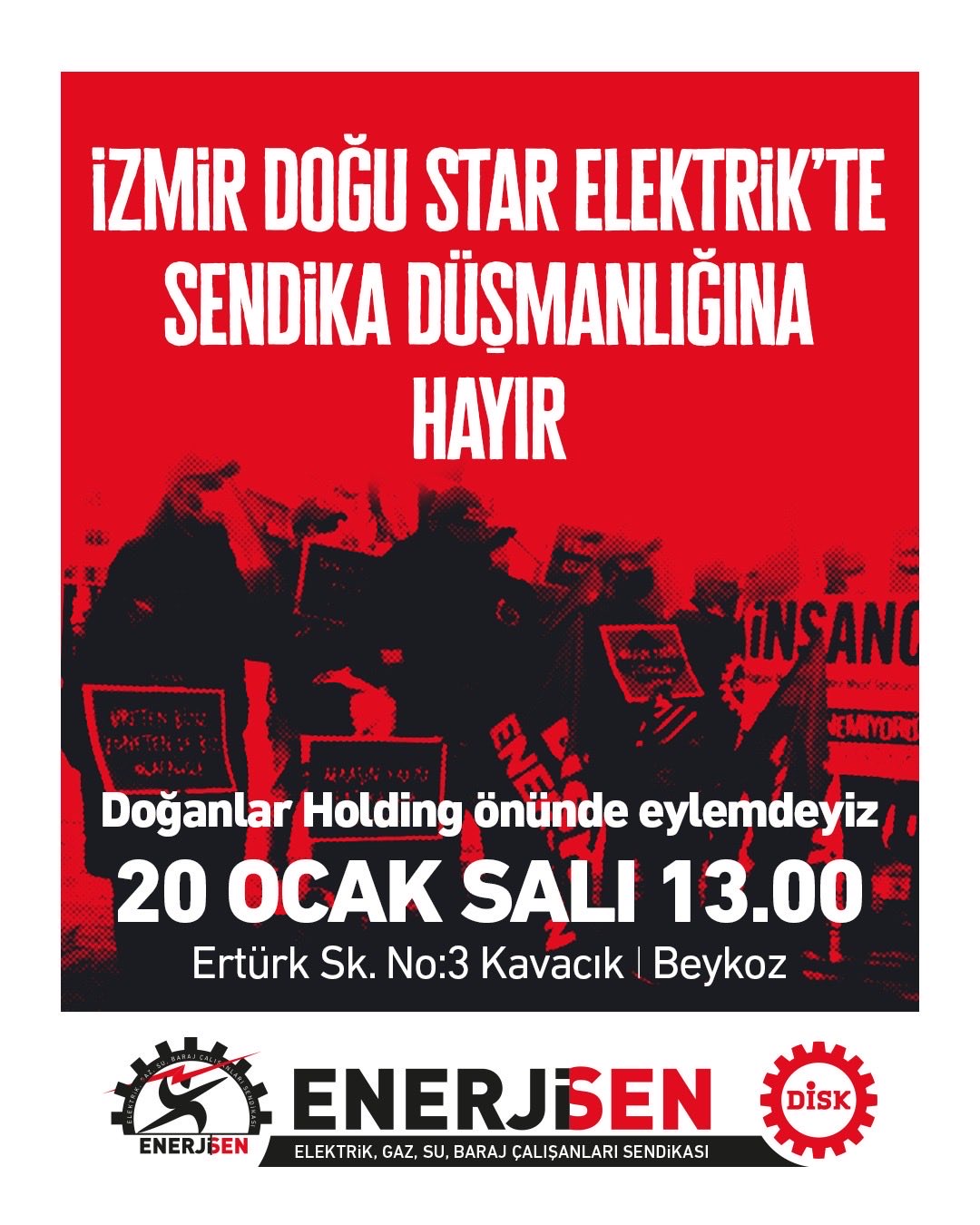DİSK/Enerji-Sen, yetki almasına rağmen sendikal faaliyetin engellendiği Doğanlar Holding’e karşı 20 Ocak’ta Beykoz’daki genel merkez önünde eylem yapacak.