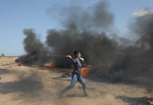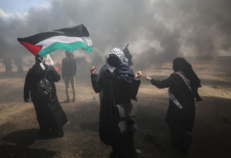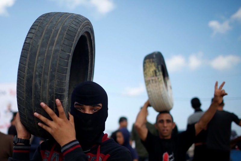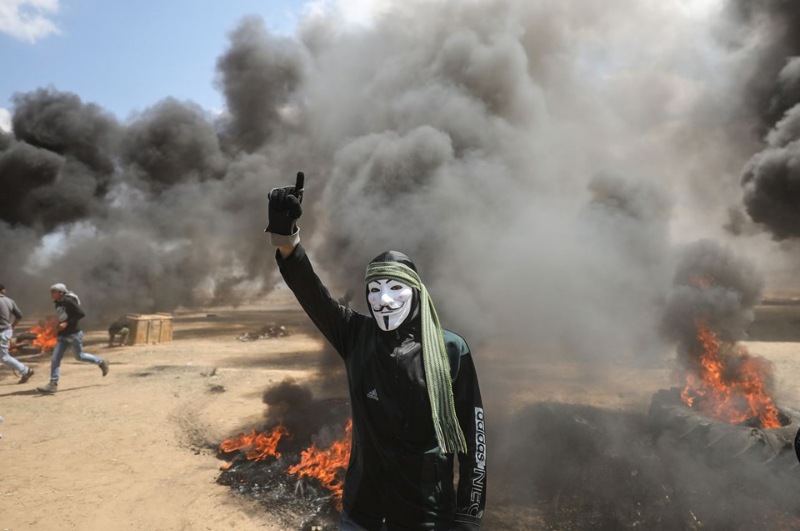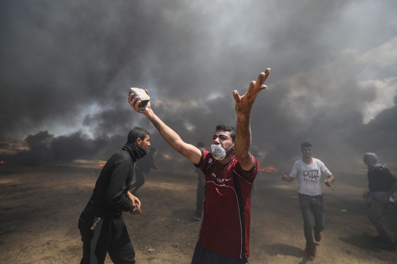 Sınırda protesto düzenleyen Filistinliler gerçek mermiyle ateş eden İsrail keskin nişancılarından ve İnsansız Hava Araçlarından korunmak için lastik yakıyor. Gazze sınırı tümüyle duman altında kaldı.