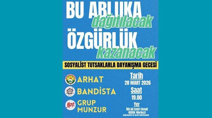“Bu abluka dağıtılacak, özgürlük kazanacak” sloganıyla gerçekleşecek etkinlik, 28 Mart Cumartesi günü saat 19.00’da İstanbul Fatih’te bulunan Ali Emiri Efendi Kültür Merkezi’nde başlayacak. Dayanışma gecesinde Grup Munzur, Bandista ve Hozan Arhat sahne alacak.