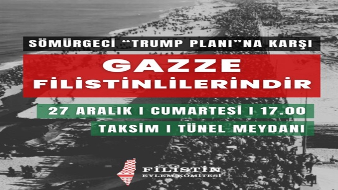 “Gazze Filistin Halkınındır. Filistin toprağı üzerinde Siyonist işgal planlarını dayatan ABD ve işbirlikçilerine karşı sokağa çıkıyoruz! Sömürgeci “Trump Planı”na karşı Filistin halkının iradesinin yanındayız! 27 Aralık Cumartesi 17.00 Taksim | Tünel” ifadelerini kullandı.