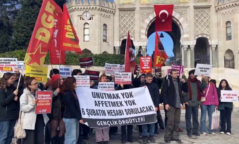 Gençlik örgütleri, 6 Şubat depremlerinin yıl dönümü dolayısıyla İstanbul Fatih’te bulunan Beyazıt Meydanı’nda basın açıklaması gerçekleştirdi. Çok sayıda gençlik örgütünün katıldığı eylemde “Unutmak yok affetmek yok 6 Şubat’ın hesabı sorulacak” pankartı açılırken, “Depremde yıkılmayan kentler kuracağız” ve “Ranta, talana, yıkıma karşı yaşamı savunuyoruz” yazılı dövizler taşındı. Açıklama boyunca “Unutmak yok, affetmek yok, helalleşmek yok” ve “6 Şubat’ın hesabı sorulacak” sloganları atıldı.