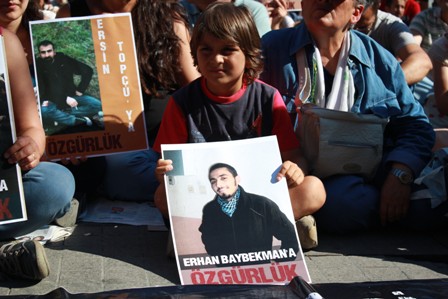 Saat 17.00’da lise önünde toplanan kitle tutsakların fotoğraflarının olduğu dövizlerle oturdu.