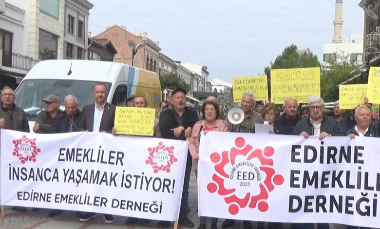 Saraçlar Caddesi’nde basın açıklaması düzenleyen Edirne Emekliler Derneği adına açıklama yapan başkan Yardımcısı Ayşe Çotuk, emeklilerin yaşam koşullarının her geçen gün daha da zorlaştığını belirterek, “Çalışma Bakanı, açlık sınırına dayanan biz emeklileri bir yük olarak görüp, maaşlarımızın düzenli ödendiğini söyleyerek ‘şükür edin’ diyor. Oysa biz, yıllarca devletimize vergisini ve sosyal güvenlik primlerini düzenli ödemiş insanlarız. Bugün yaşadığımız zorlukların sorumlusu biz değiliz” dedi.
