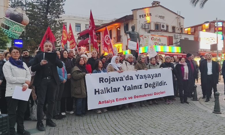 Suriye’de HTŞ güçlerinin Rojava’ya yönelik saldırılarına karşı Antalya Emek ve Demokrasi Güçleri Attalos Meydanı’ndaydı. Antalyalılar HTŞ yönetiminin daha önce Dürzilere ve Alevilere yönelik saldırılarını da hatırlatarak “Geçici Şam yönetimi işbaşına geldiği andan itibaren halkların ve inançların eşit ve özgür birlikteliğine dayanan anayasal-demokratik bir rejim inşa etmeyi bilinçli biçimde reddetmekte; çatışma, korku ve şiddet yoluyla tekçi iktidarını kalıcılaştırmayı hedeflemektedir” dedi.