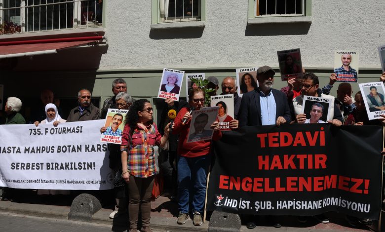 İnsan Hakları Derneği (İHD) İstanbul Şubesi Hapishane Komisyonu, “F Oturması” eyleminin 735’incisini şube binası önünde gerçekleştirdi. Bu haftaki eylemde, Van Yüksek Güvenlikli Hapishanesi’nde tutulan ağır hasta tutsak Botan Karsu’nun sağlık durumuna dikkat çekildi.