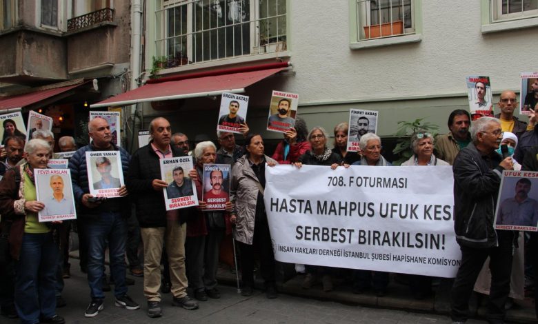 İnsan Hakları Derneği (İHD) İstanbul Şubesi Hapishane Komisyonu, hasta tutsakların durumuna dikkat çekmek amacıyla düzenlediği “F Oturması” eyleminin 708’incisini gerçekleştirdi. Dernek binası önünde yapılan eylemde, 27 yıldır hapishanede olan ağır hasta tutsak Ufuk Keskin’in sağlık durumu gündeme getirildi.