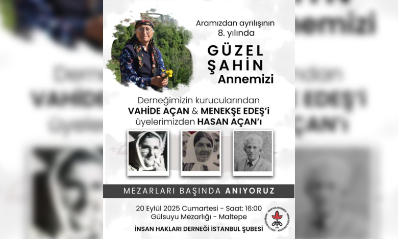 İHD İstanbul şube, ” Aramızdan ayrılışının 8. Yılında Güzel Şahin Annemizi ve aynı mezarlıkta defnedilmiş olan derneğimizin kurucularından Vahide Açan Annemiz ve üyelerimiz Menekşe Edeş Annemiz ile Hasan Açan’ı mezarları başında anıyoruz. Düzenleyeceğimiz anmaya katılımınızı dileriz. “ sözleriyle Gülsuyu mezarlığındaki anmaya çağrı yaptı.
