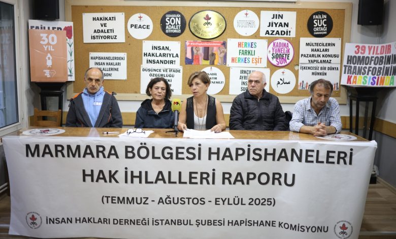 İSATNBUL – İnsan Hakları Derneği (İHD) İstanbul Şubesi, Temmuz, Ağustos ve Eylül 2025 aylarını kapsayan “Marmara Bölgesi Hapishaneleri Hak İhlalleri Raporu”nu dernek binasında düzenlediği basın toplantısıyla açıkladı.