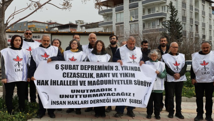 İnsan Hakları Derneği (İHD), 6 Şubat depremlerinin üçüncü yılı dolayısıyla Antakya, Mersin, Adana ve İzmir başta olmak üzere birçok şubesinde açıklamalar yaptı. Açıklamalarda, depremde yaşanan ölümlerin sorumlularının yargılanması ve deprem bölgelerinde süren hak ihlallerinin giderilmesi çağrısı yapıldı.
