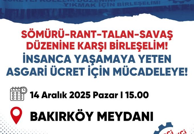 “Sömürü, Rant, Talan, Savaş düzenine karşı birleşelim! İnsanca yaşamaya yeten asgari ücret için mücadele edelim!” şiarıyla düzenlenen eylem 14 Aralık günü saat: 15.00’te Bakırköy Özgürlük Meydanında.