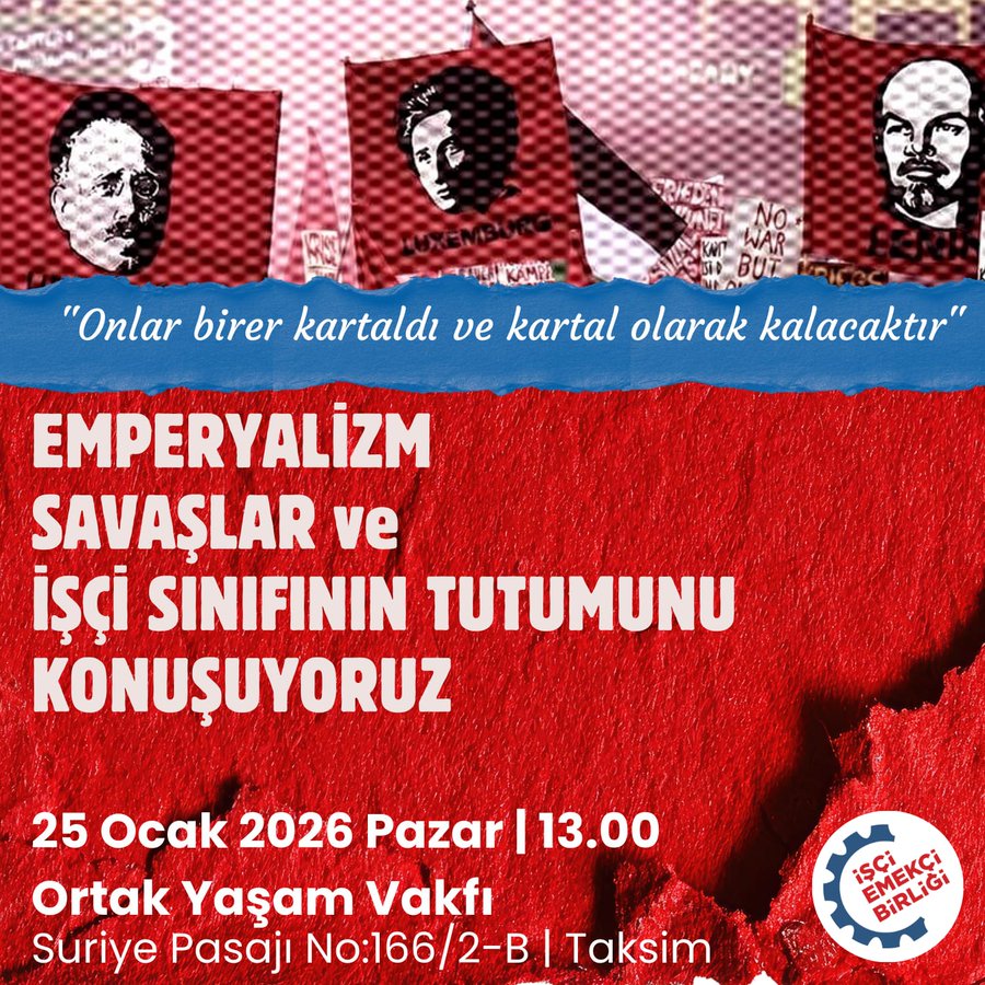 İşçi Emekçi Birliği, emperyalizm, savaşlar ve işçi sınıfının tutumunun ele alınacağı bir forumu 25 Ocak’ta İstanbul Taksim’de düzenleyeceğini duyurdu.