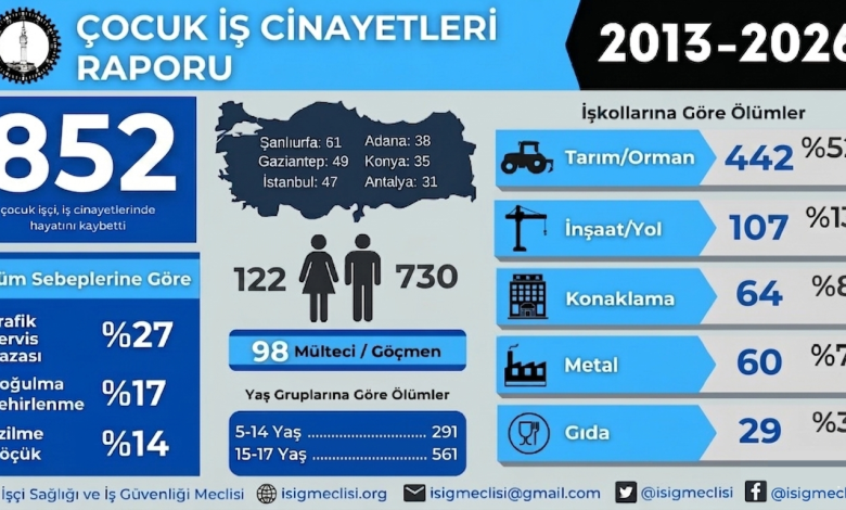 Raporda, “Her yıl 13-14 çocuk işçi ölümü kayıtlara geçiyor ve bu ölümler duyu(ru)lmuyordu. Ancak 2013 yılından beri İSİG Meclisi olarak kayıt altına aldığımız iş cinayetleri raporlarında da belirttiğimiz üzere her yıl 63-64 çocuk hayatını kaybetti ve bu tablo son iki yılda daha da derinleşti. 2024 yılında 71 çocuk işçi ölürken 2025 yılında ölen çocuk işçi sayısının 94 olması çocuk emeğinin durumunu özetliyor” dedi.