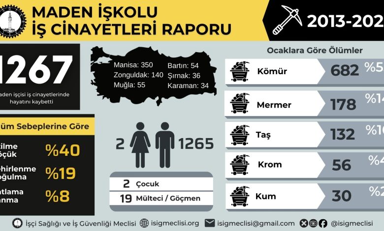 İşçi Sağlığı ve İş Güvenliği (İSİG) Meclisi, 2013-2025 yıllarını kapsayan maden işkolundaki iş cinayetlerini raporladı. Rapora göre, son 13 yılda Türkiye genelinde 1267 işçi iş cinayetlerinde hayatını kaybetti. Ölümlerin büyük çoğunluğu linyit ve taş kömürü, mermer ve taş ocaklarında gerçekleşti.