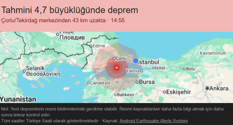 Gerçek zamanlı deprem bilgisi sağlayan bağımsız bilimsel kuruluş EMSC’ye göre, deprem Marmaraereğlisi (Tekirdağ) merkezine yaklaşık 20 kilometre uzaklıkta hissedildi.