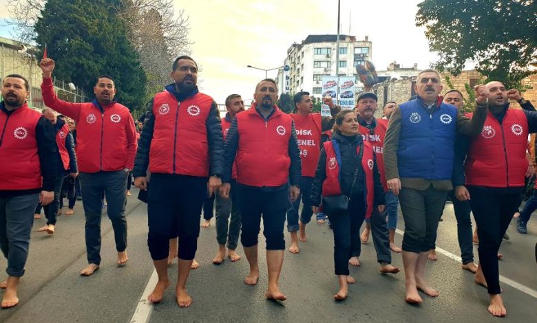 Sabah saatlerinde sendika binası önünde toplanan Genel-İş üyesi işçiler, “Çıplak ücrete çıplak ayak” sloganıyla Kültürpark içinde bulunan belediye binası önüne çıplak ayak yürüyüşü gerçekleştirdi.
