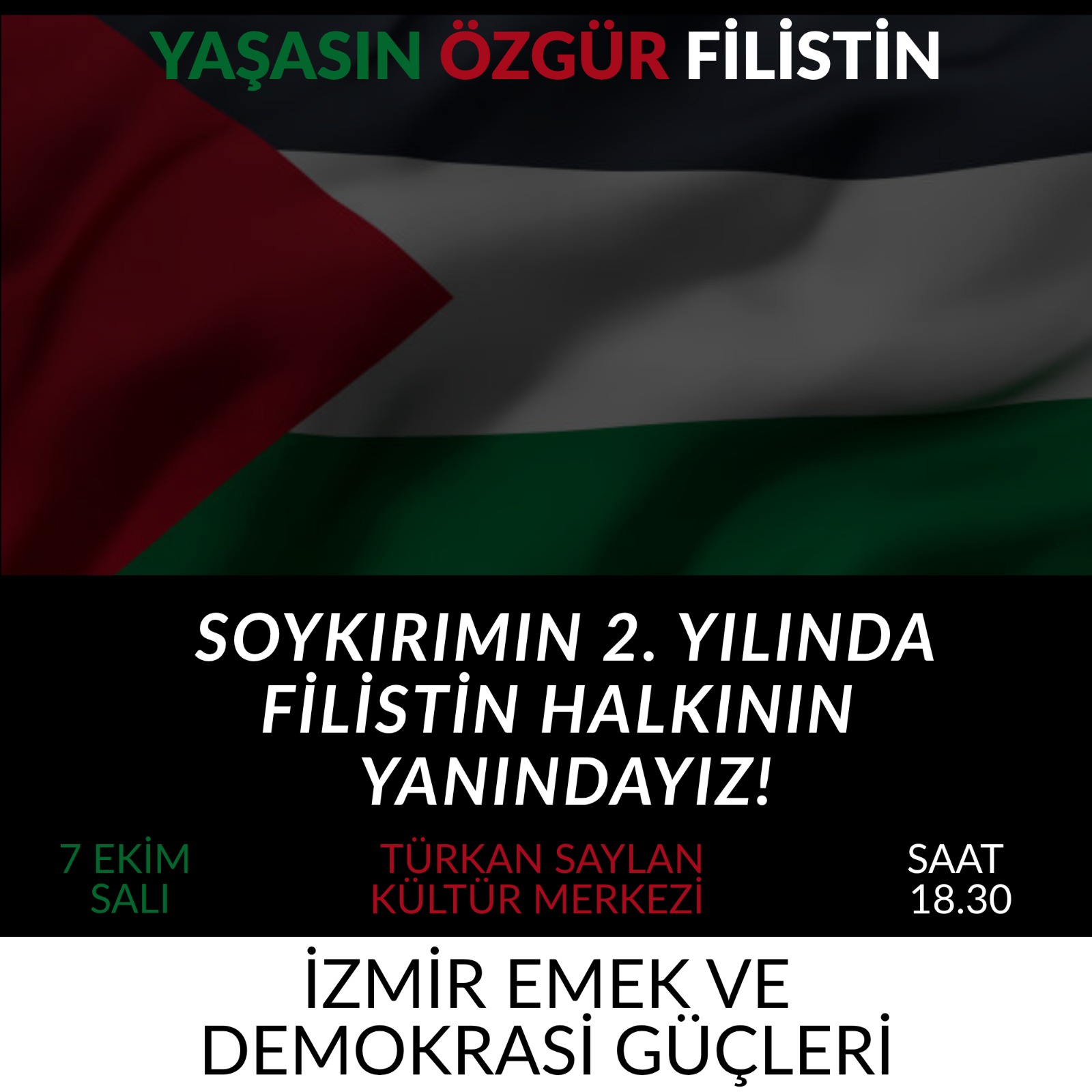 “7 Ekim’in yıldönümünde Filistin halkı için sokağa çıkıyoruz. Soykırımcı İsrail devleti ve işbirlikçilerine karşı ses çıkarmak için herkesi bileşeni olduğumuz İzmir Emek ve Demokrasi Güçleri’nin yapacağı eyleme davet ediyoruz. Siyonizm ve emperyalizm yenilecek! Direnen Filistin halkı kazanacak!”