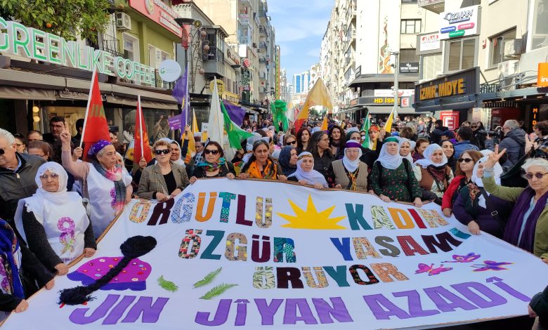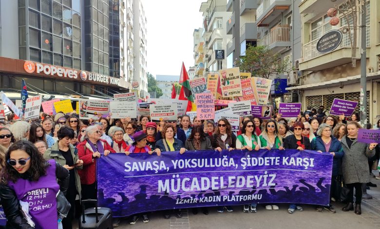 İzmir Kadın Platformu’nun çağrısıyla Alsancak Türkan Saylan Kültür Merkezi önünde toplanan kadınlar, Kıbrıs Şehitleri Caddesi boyunca “Savaşa, yoksulluğa, şiddete karşı mücadeleyiz” yazılı pankart eşliğinde yürüyüşe geçti.