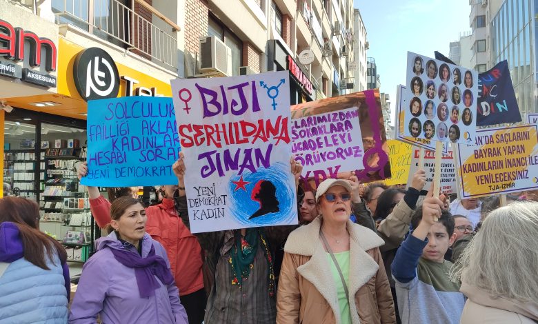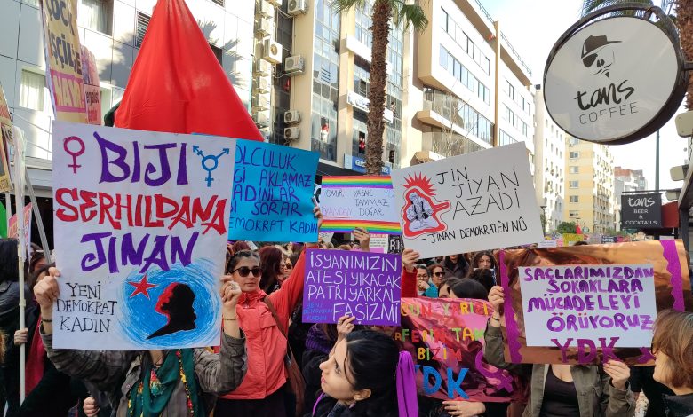 Yürüyüşte yer alan Yeni Demokrat Kadın (YDK), “Onur yasak tanımaz, isyandan doğar”, “Solculuk failliği aklamaz kadınlar hesabı sorar”, “Ataerkiye sömürüye yoksulluğa karşı alevlenen yürekleri otur, izle!”, “Jin jiyan azadi”, “Göğün yarısı zaferin tamamı bizim”, “Hormon haktır engellenemez”, “Biji serhıldana jinan”, “Saçlarımızdan sokaklara mücadeleyi örüyoruz” yazılı dövizler taşıdı.