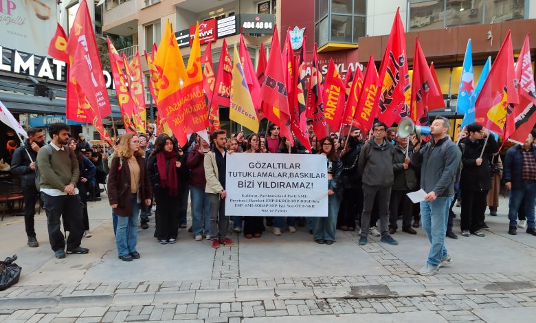 Alsancak Türkan Saylan Kültür Merkezi önünde yapılan eylemde sık sık “Gözaltılar, tutuklamalar, baskılar bizi yıldıramaz”, “Kurtuluş devrimde, sosyalizmde”, “Yaşasın devrimci dayanışmamız” gibi sloganlar atıldı.