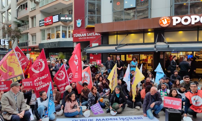 İzmir’de Doruk Maden işçileri ile dayanışma amacıyla oturma eylemi ve basın açıklaması gerçekleştirildi. Bağımsız Maden-İş Sendikası’nın örgütlediği Alsancak Türkan Saylan Kültür Merkezi önünde yapılan eyleme Partizan ve Yeni Demokrat Gençlik de katıldı.