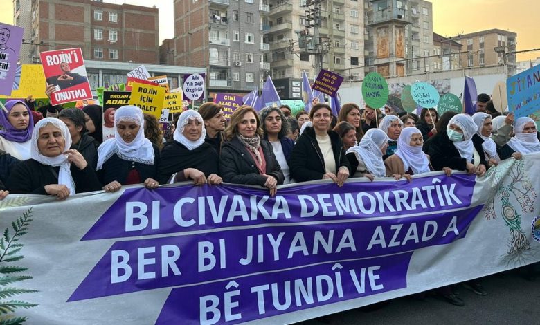 Diyarbakır’da kadınlar eski hapishane önünde bir araya geldi. “Li hemberê tundiyê em jiyana azad rêxistin dikin”, “Em bi jin, jiyan, azadî xwe diparêzin” ve “Kadınların barışı özgür yaşamı savunmaktır” yazılı döviz ve pankartlar taşıyan kadınlar, alkış ve sloganlarla Ofis Semti’ndeki AZC Plaza önüne yürüdü.