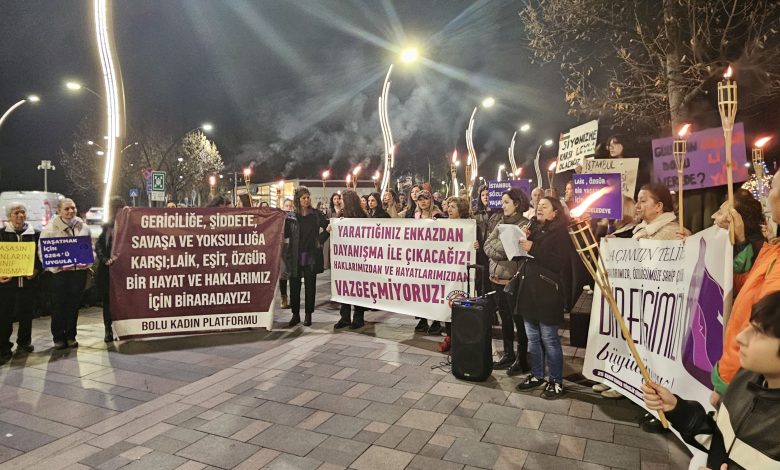 Bolu Kadın Platformu, İzzet Baysal Anıtı önünde toplanarak meşaleli yürüyüş gerçekleştirdi. Platform adına konuşan SES Şube Eş Başkanı Fatma Öztürk Koçyiğit, kadınların güvencesiz çalışmaya, görünmeyen ev içi emek yüküne ve şiddet tehdidine mahkûm edilmesini reddettiklerini söyledi. Eğitimde toplumsal cinsiyet eşitsizliğini derinleştiren adımlara karşı mücadele çağrısı yaptı.