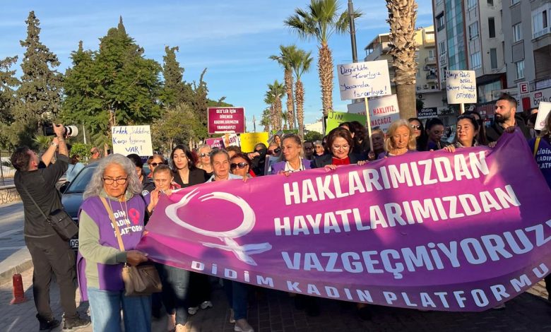 Didim Kadın Platformu’nun çağrısıyla bir araya gelen kadınlar belediye önünden Kent Meydanı’na yürüdü. Aralarında YDK’nın da bulunduğu kadınlar, şiddete ve ekonomik eşitsizliklere karşı birlikte mücadele vurgusu yaptı.