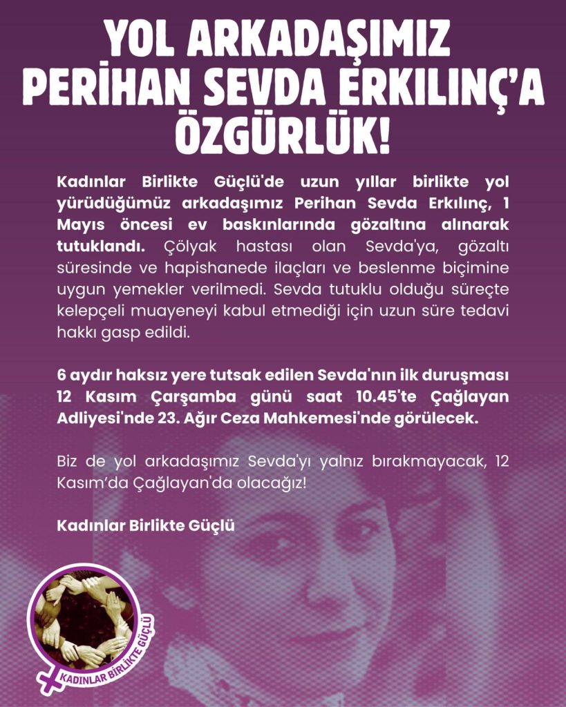 “Uzun yıllar birlikte yol yürüdüğümüz yol arkadaşımız Perihan Sevda Erkılınç, haksız yere 6 aydır tutuklu bulunuyor.