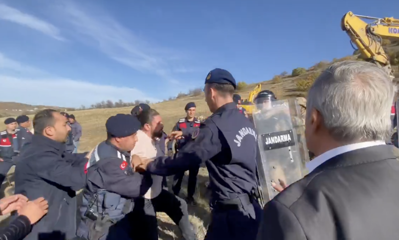 Bugün de bölgede faaliyetlerini sürdüren taş ocağının yüklenici firması Çelik Holding’e ait iş makineleri çalışmaya devam ederken, köylülerin protestosu sürüyor. İş makinelerini engellemeye çalışan köylüler, jandarmanın müdahalesiyle karşılaştı.