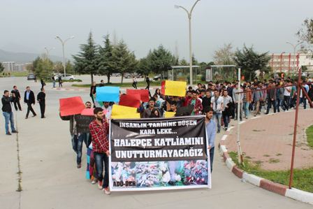 Hatay’da Mustafa Kemal Üniversitesi’ne bağlı Amanos Demokratik Özgür Öğrenci Derneği (ADÖ-DER) öncülüğünde, Xalepçe başta olmak üzere Beyazıt, Gazi, Qamişlo ve Roboski katliamlarını protesto etme amaçlı kampus alanında yürüyüş ve etkinlik gerçekleştirildi.
