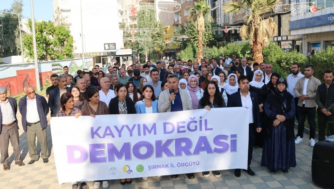Şırnak’ın Cizre ilçesindeki Sanat Sokağı’nda yapılan açıklamaya siyasi parti ve demokratik kitle örgütü temsilcileriyle çok sayıda kişi katıldı. “Kayyım değil, demokrasi” pankartı açılan açıklamada, ortak basın metnini DEM Parti Cizre İlçe Eşbaşkanı Yılmaz Sanrı okudu.