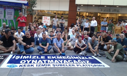 KESK İzmir Şubeler Platformu OHAL ile birlikte çıkartılan KHK(Kanun Hükmünde Kararname) ile ihraç edilen kamu emekçileri için her çarşamba günü, Karşıyaka’da yaptığı oturma eylemini bu hafta Kıbrıs Şehitleri Caddesi’ndeki Türkan Saylan Kültür Merkezi önünde gerçekleştirdi.