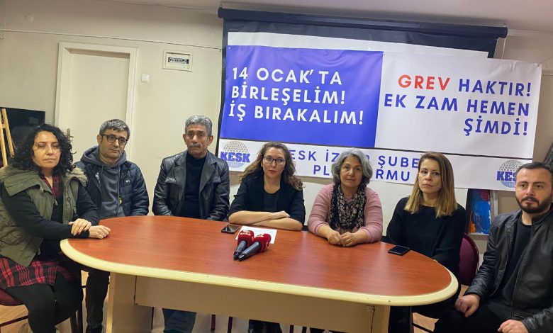Kamu Emekçileri Sendikaları Konfederasyonu (KESK) İzmir Şubeler Platformu, 14 Ocak’ta gerçekleştirilecek iş bırakma eylemi öncesi Eğitim Sen İzmir 1 No’lu Şube binasında basın toplantısı düzenledi. Açıklamayı KESK İzmir Dönem Sözcüsü Başak Edge Gürkan okudu.