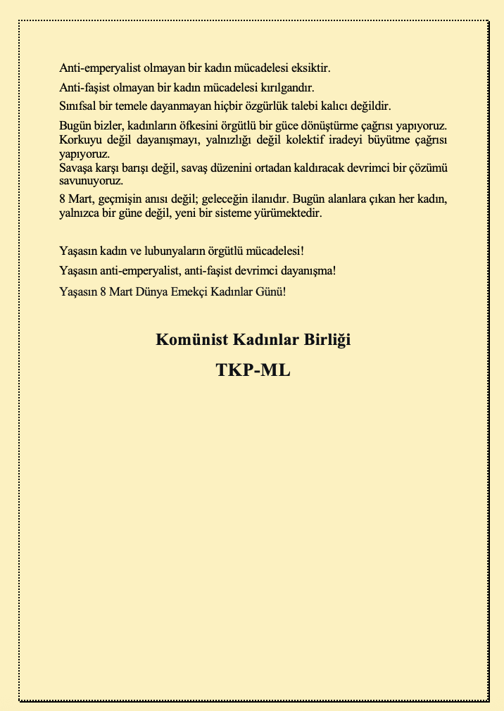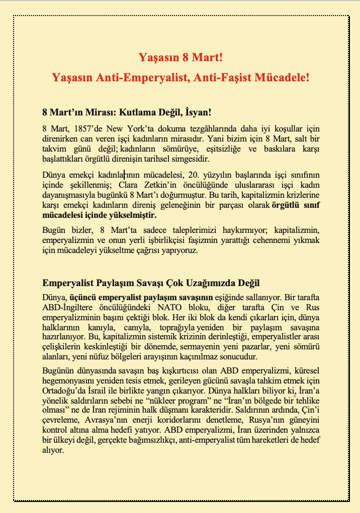 “Bugün bizler, 8 Mart’ta sadece taleplerimizi haykırmıyor; kapitalizmin, emperyalizmin ve onun yerli işbirlikçisi faşizmin yarattığı cehennemi yıkmak için mücadeleyi yükseltme çağrısı yapıyoruz.”