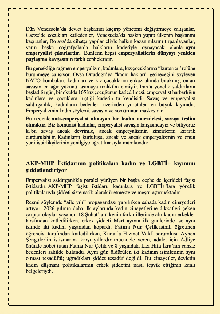 “Bu gerçekliğe rağmen emperyalizm, kadınlara, kız çocuklarına ‘kurtarıcı’ rolüne bürünmeye çalışıyor. Oysa Ortadoğu’ya ‘kadın hakları’ getireceğini söyleyen NATO bombaları, kadınları ve kız çocuklarını enkaz altında bırakmış, onları savaşın en ağır yükünü taşımaya mahkûm etmiştir.”