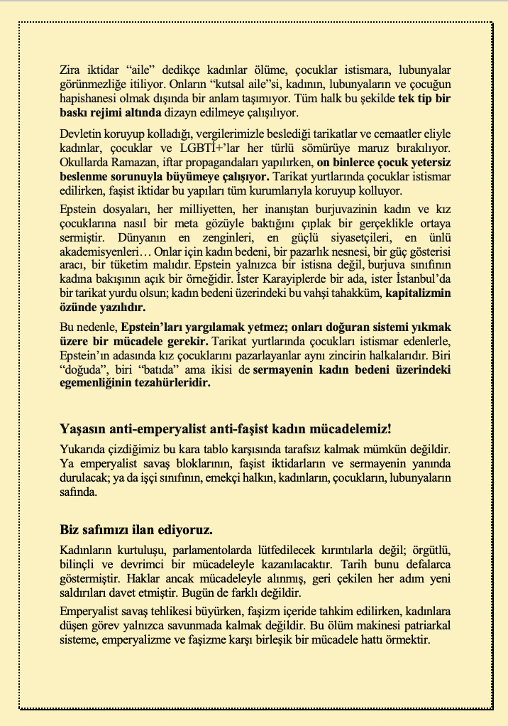 “AKP-MHP faşist iktidarı, kadınlara ve LGBTİ+’lara yönelik politikalarıyla şiddeti sistematik olarak üretmekte ve meşrulaştırmaktadır. Zira iktidar ‘aile’ dedikçe kadınlar ölüme, çocuklar istismara, lubunyalar görünmezliğe itiliyor. Onların ‘kutsal aile’si, kadının, lubunyaların ve çocuğun hapishanesi olmak dışında bir anlam taşımıyor.”