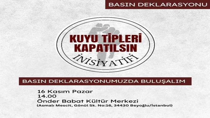 Kuyu Tipleri Kapatılsın İnisiyatifi açıklamasında, “İnisiyatifimizin amaçları, hedefleri ve çalışmalarına ilişkin gerçekleştireceğimiz basın deklarasyonunda buluşalım” dedi ve 16 Kasım Pazar günü Önder Babat Kültür Merkezi (Beyoğlu), saat 14.00 buluşma çağrısı yaptı.