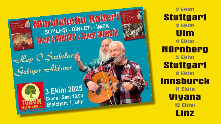Şair-yazar Sezai Sarıoğlu ile müzisyen Şenol Morgül, “Memleketin Halleri” başlıklı etkinlik dizisiyle Almanya ve Avusturya’da okurları ve dinleyicileriyle buluşacak.