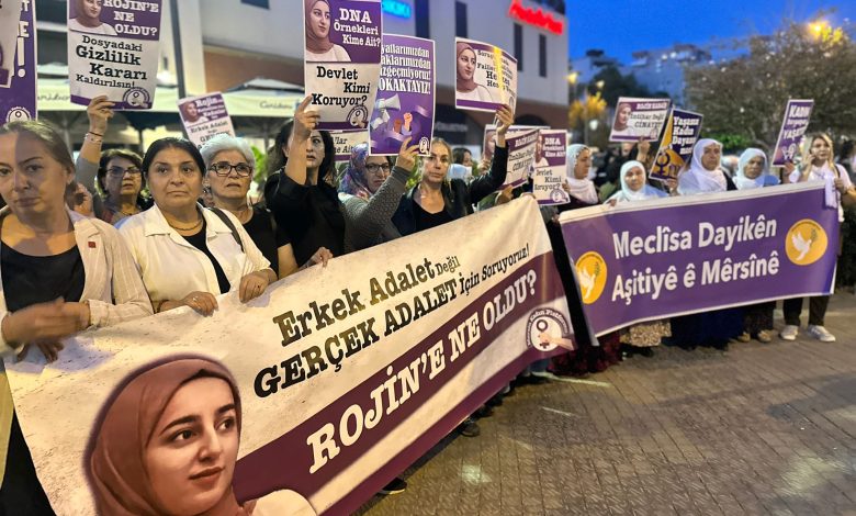 Mersin Kadın Platformu, 27 Eylül 2024’te kaybolduktan 18 gün sonra cansız bedeni Van Gölü kıyısında bulunan 21 yaşındaki üniversite öğrencisi Rojin Kabaiş için Forum AVM önünde eylem yaptı.