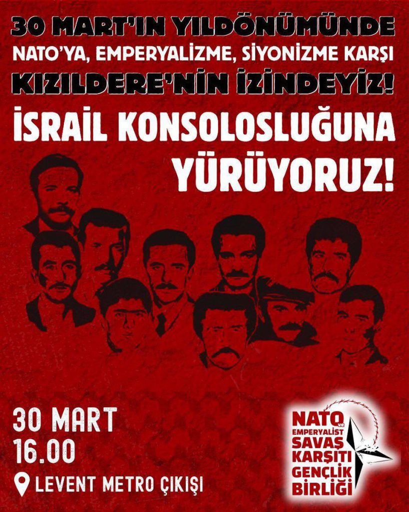 İstanbul’da ise Levent Metro çıkışında saat 16.00’da başlayacak yürüyüş için çağrı yapıldı. Paylaşımda, “Onlar ölmediler yok, Ateş fitiller gibi: Dimdik ayakta, Barut ortasındalar! NATO ve Emperyalist Savaş Karşıtı Gençlik Birliği olarak Kızıldere katliamının yıldönümünde bütün gençliği On’ların mücadelesini sahiplenmeye, katillerinden hesap sormaya çağırıyoruz. NATO’ya, emperyalizme, siyonizme karşı İsrail konsolosluğuna yürüyoruz” denildi.